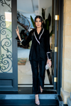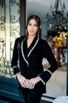 This ensemble features a luxurious velvet coat with a shawl collar, adorned with intricate hand-embellished crystal detailing along the collar and sleeve cuffs. The coat is paired with sleek, straight trousers, creating a sophisticated and polished look.