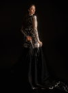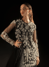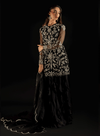A vision of elegance and sparkle, this black net tunic dazzles with all over crystal embellishment, creating a look that’s both regal and contemporary. Paired with ruffled trousers that add fluid movement and a scalloped organza dupatta finished with crystal detailing, this ensemble strikes the perfect balance between glamour and grace.