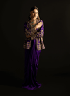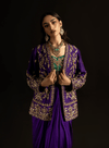 Regal and refined look, this purple zardozi embellished jacket is intricately hand worked with rich zardozi detailing. Paired with an emerald green bustier mirroring the same exquisite craftsmanship, the ensemble strikes a perfect contrast of jewel tones. The look is completed with a purple charmeuse dhoti style draped skirt, lending a fluid, contemporary silhouette that seamlessly blends traditional artistry with modern allure.