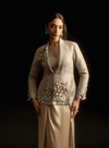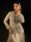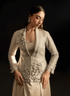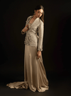 An enchanting display of craftsmanship, this silver bugle beaded coat shimmers with intricate beadwork and features delicate 3D flowers blooming along the hem of the coat and sleeves. Paired with a flared charmeuse skirt and a slip inside the jacket. The look reflects refined glamour and graceful movement.