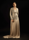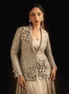 Silver Bugle Beaded Coat with 3D Flowers and Flared Charmeuse Skirt