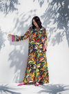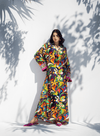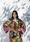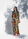 The Lazuli printed kaftan features an all over multicolored bold print set against a rich navy blue base. Designed with a tie-up neckline accented by playful pompom details, this kaftan brings a fun, effortless charm to relaxed dressing.