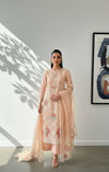 Enhance your wardrobe with this elegant peach ensemble where pastel peach meets delicate floral appliqué in this beautifully crafted outfit. Styled with a classic izaar and a sheer organza dupatta delicately embroidered with subtle floral accents, adding a light, graceful finish to complete the dreamy appeal of the ensemble.