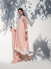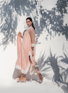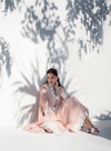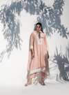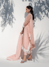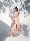 This refined ensemble features a pink organza drop hemline tunic crafted from fully self embroidered organza, offering a rich yet delicate texture. White lace detailing enhances the drop hemline, neckline, and sleeves, while hand embellished buttons add an artisanal finish. Paired with classic straight pants and completed with a chiffon dupatta edged with delicate lace on all four sides, this outfit embodies graceful elegance and timeless charm.