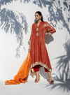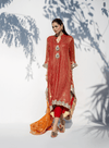 Red and Gold Sequinned Drop Hemline Tunic with Orange Organza Dupatta and Izaar