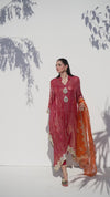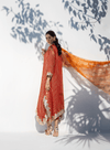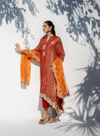 This red and gold sequined tunic is designed with a graceful hand embellished drop hemline and lachha adorning the neckline. The sparkly gold sequins add just the right amount of shimmer, making it a refined yet striking choice for special occasions paired with a classic Izaar, adding a bold touch is the embellished orange organza dupatta, richly detailed with gold embroidery and traditional scalloped border. The vibrant contrast of orange against the red and gold ensemble makes for a striking and unforgettable look.