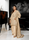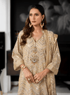 Gold zig zag sequined tunic featuring hand embellished lachas on the neckline, paired with a traditional farshi shalwar. The look is completed with a dupatta edged on all four sides with embellished lace for a regal finish.