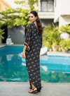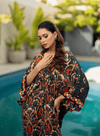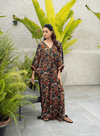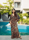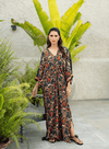 Sia printed kaftan, a contemporary silhouette featuring graceful pleats and chic slits on both sides. The front and back showcasing contrasting prints, making it a striking yet effortless style statement..